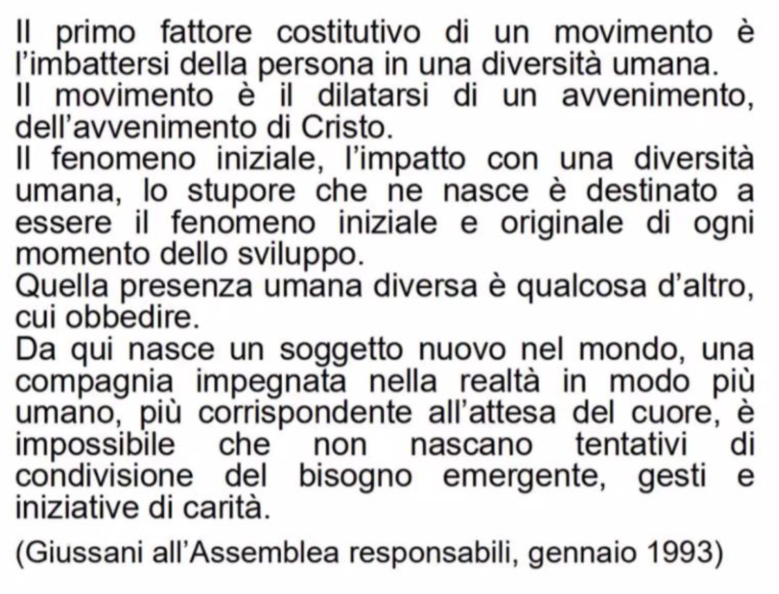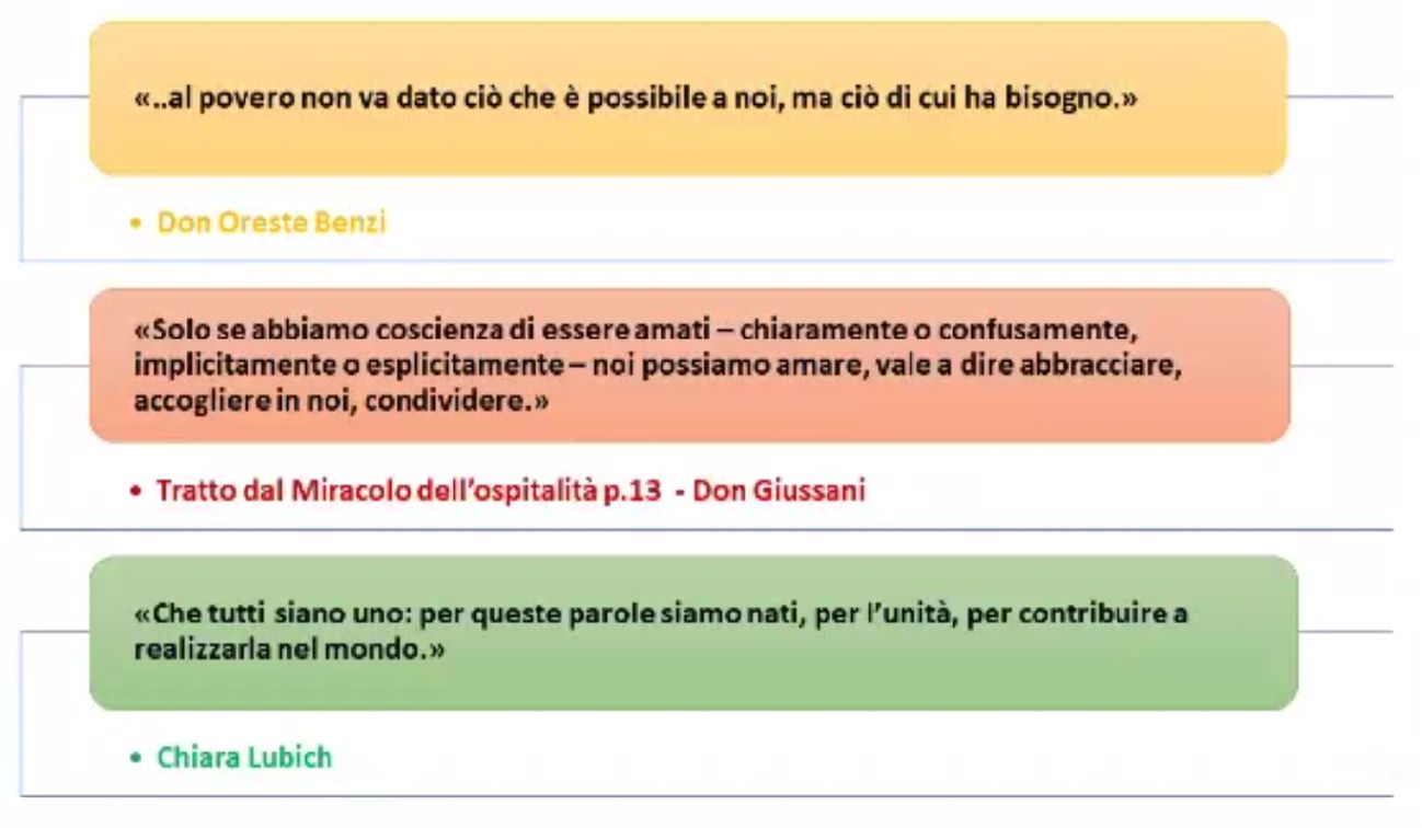 Don Giussani ha creduto fermamente nella carità, uno dei baluardi del suo messaggio e della sua esperienza e testimonianza; mandava i giovani a fare nella bassa (Lombardia) a stare insieme a far dei giochi con i bambini proprio per imparare il dono dell'accoglienza e del sentirsi accolti. Siamo tutti bisognosi di essere accolti e nell'esperienza del dare uno sente di essere accolto amato perché l'altro ti rivela questo, ti rimanda a questo bene. Noi siamo cresciuti dentro a questa esperienza avendo questo seme di voler sperimentare questo carisma di Don Giussani Famiglie per accoglienza - iniziano ad avere un luogo dove potersi confrontare alla luce dell'esperienza cristiana, che entra nella vita sociale; l'associazione si è propagata per tutta l'Italia e in diversi paesi del mondo. Non è un'organizzazione, ma è un'esperienza, è nell'esperienza che Dio arricchisce il nostro niente e perdona la nostra miseria - esperienza di conversione a Lui, a noi interessa la Sua presenza, portare Lui Insieme il cammino è ancora più bello!